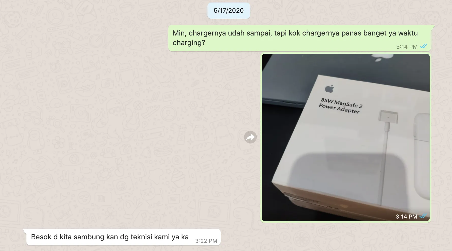 Besoknya saya mendapat telepon dari teknisi iColor, saya mengkonfirmasi ulang mengenai originalitas barang dan menanyakan perihal Magsafe yang sangat amat panas.