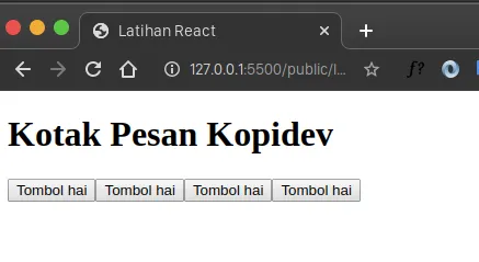 function MyButton(props) { return ( <button onClick={() => { alert(props.pesan); }} > {props.judul} </button> ); } <div></div> function MessageBox() { return ( <div> <MyButton judul="Arryangga" pesan="Selamat Datang Arryangga" /> <MyButton judul="Jokowi" pesan="halo boskuuuuhhhhh" /> <MyButton judul="Soekarno" pesan="Gimana pak disana? Enak?" /> </div> ); } <div></div> ReactDOM.render(<MessageBox />, document.getElementById("root"));