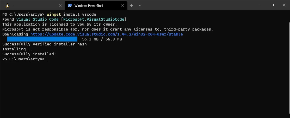 Saya coba melakukan installasi vscode menggunakan WinGet, dengan menulis perintah winget install vscode , begini kira-kira prosesnya